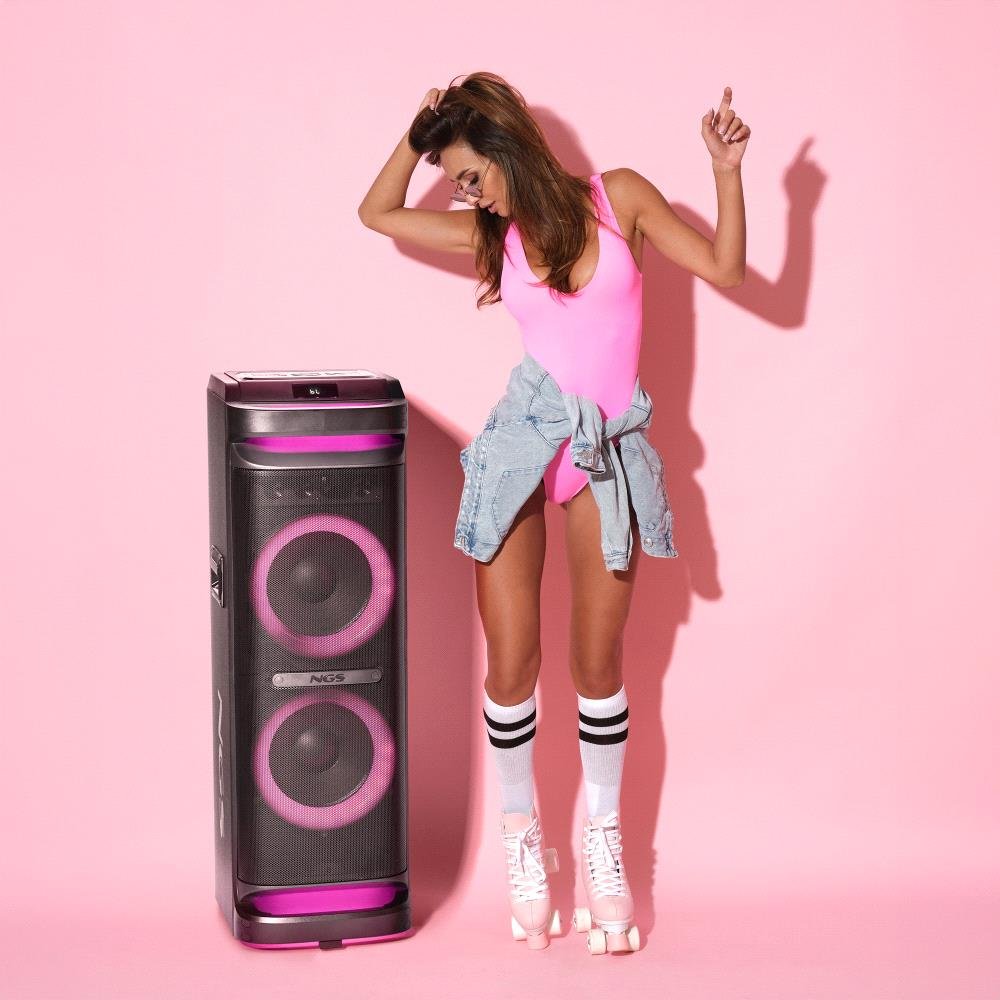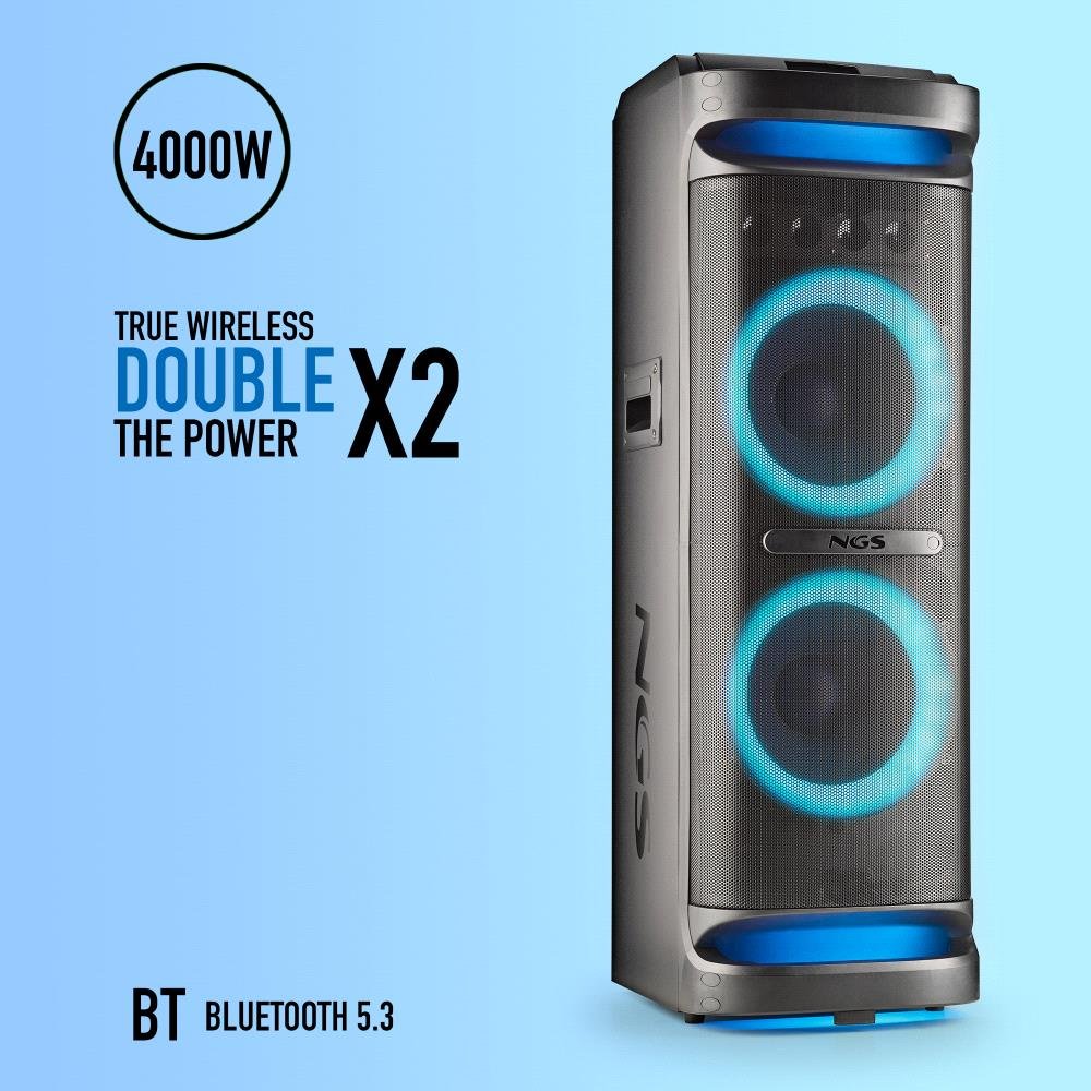 Coluna Bluetooth NGS Wildspace3 4000W preta com som potente, estrutura robusta e conectividade avançada — perfeita para festas e ambientes exigentes.