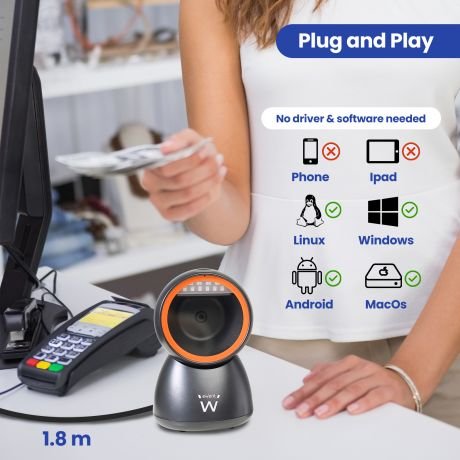 Descrição do Produto – O POS Scanner Ewent USB 1D/2D/QR é um leitor omnidirecional de mesa, projetado para leitura rápida e precisa de códigos de barras em papel e em telas.